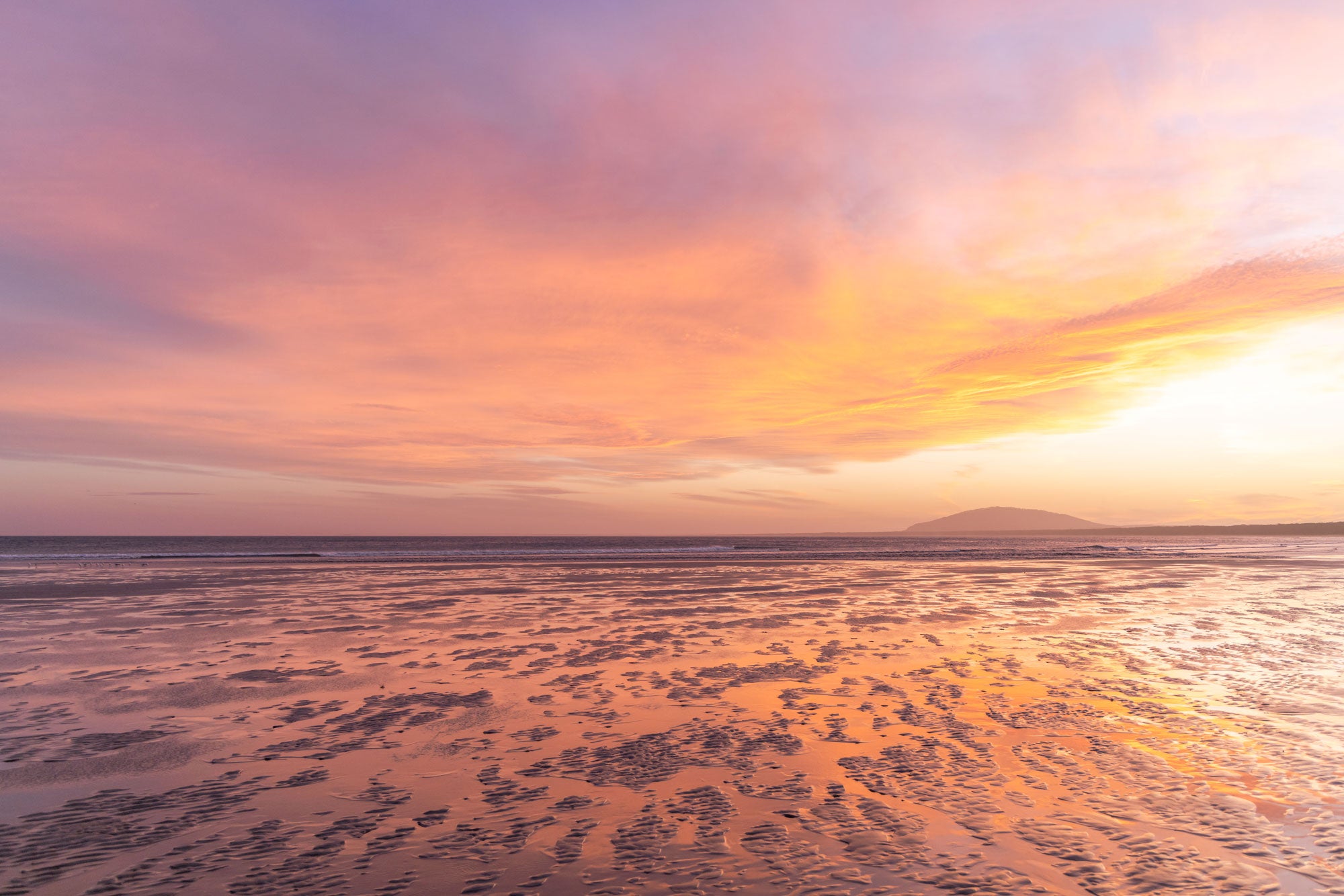 At low tide, Seven Mile Beach transforms into a glowing canvas as the last light of sunset washes the shoreline in radiant pink. Wet sand becomes a natural mirror, reflecting the sky in soft, luminous tones while gentle textures ripple toward the horizon.