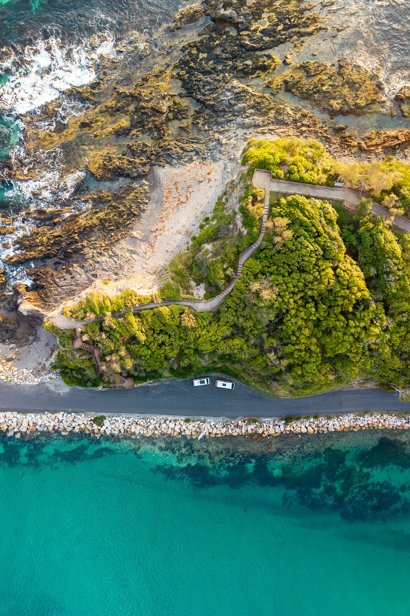 An aerial shot of the interesting shapes and textures that make up Bar Rock lookout in Narooma.