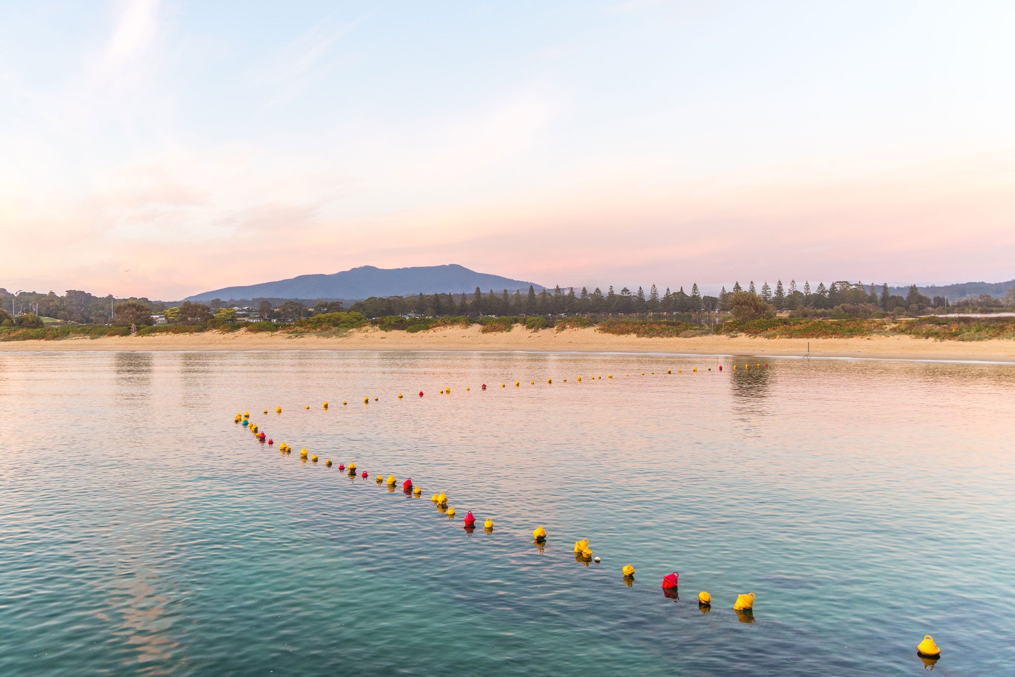 Standing on the breakwall at Bar Bar Beach in Narooma, looking west over the swim area at Wagonga Beach on a beautiful pink sunrise.