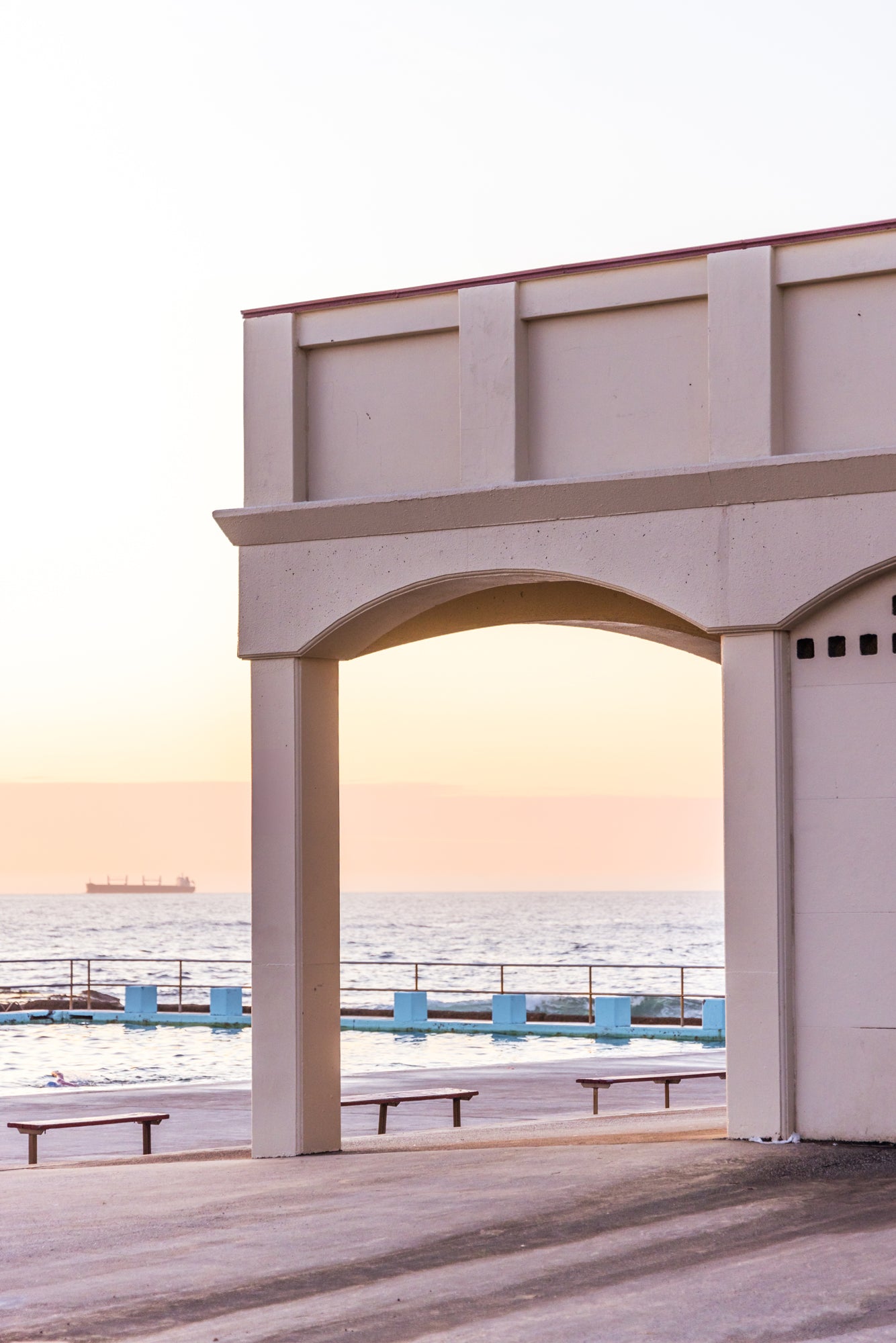 A breathtaking photo of the Woonona Bathers building illuminated in vibrant pink hues, perfectly complemented by a stunning pink sunrise in the background.