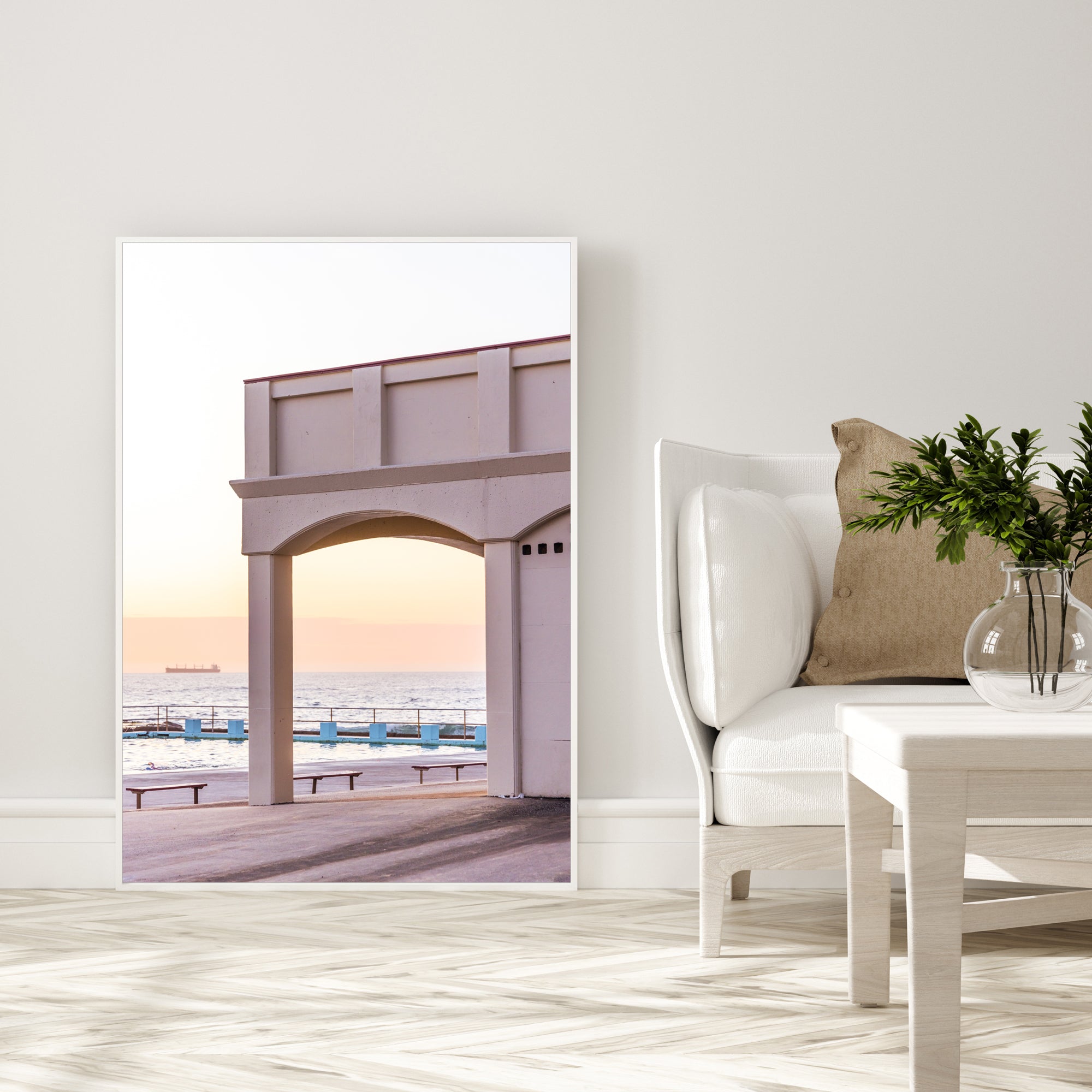 Please note: Our white framed canvases are made from white oak. They have a smooth white finish with a subtle wood grain visible.
