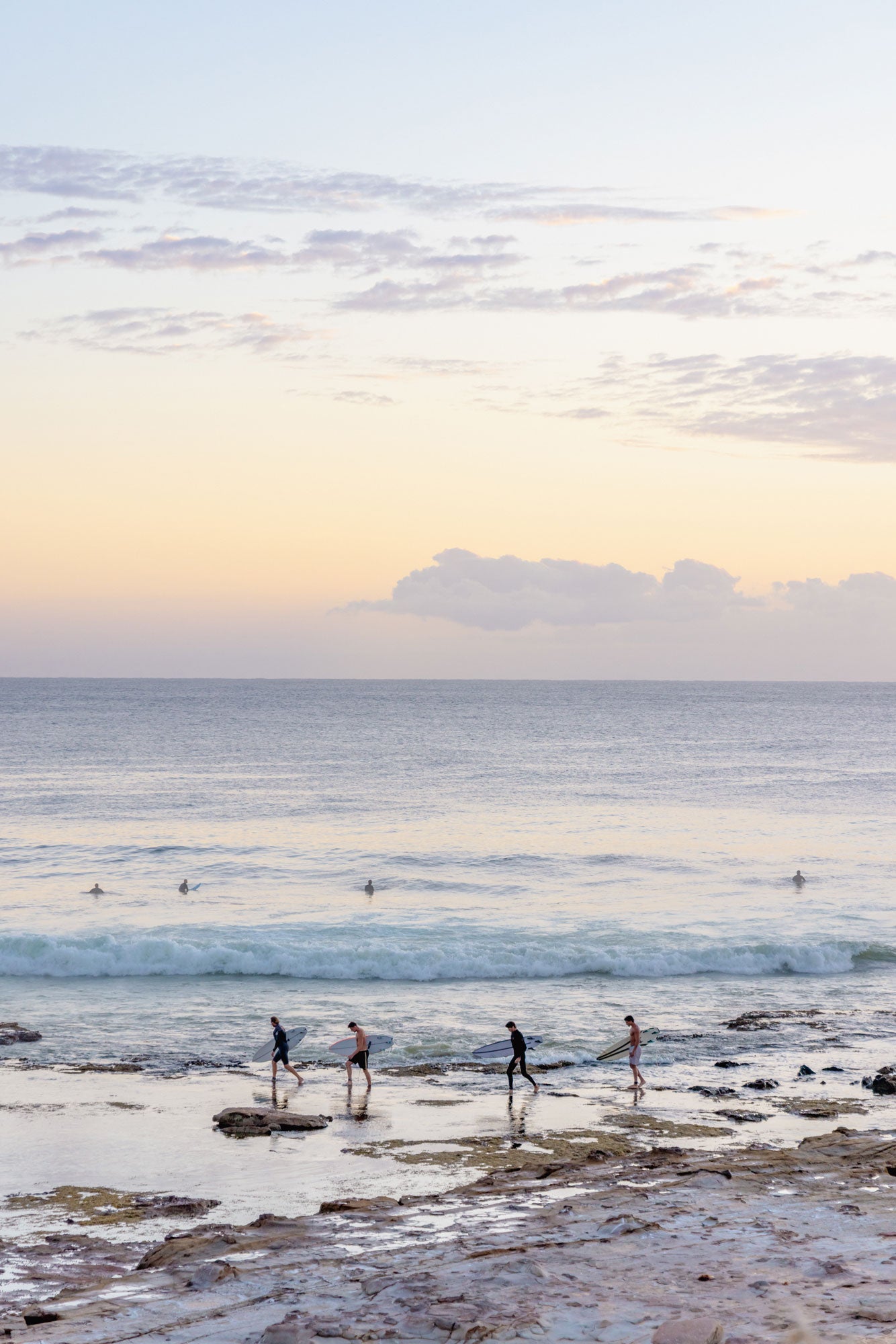 "Rockwalk" captures a timeless surf ritual at Sandon Point, as four barefoot surfers make their way in single file across the rocky shoreline, heading toward the water.