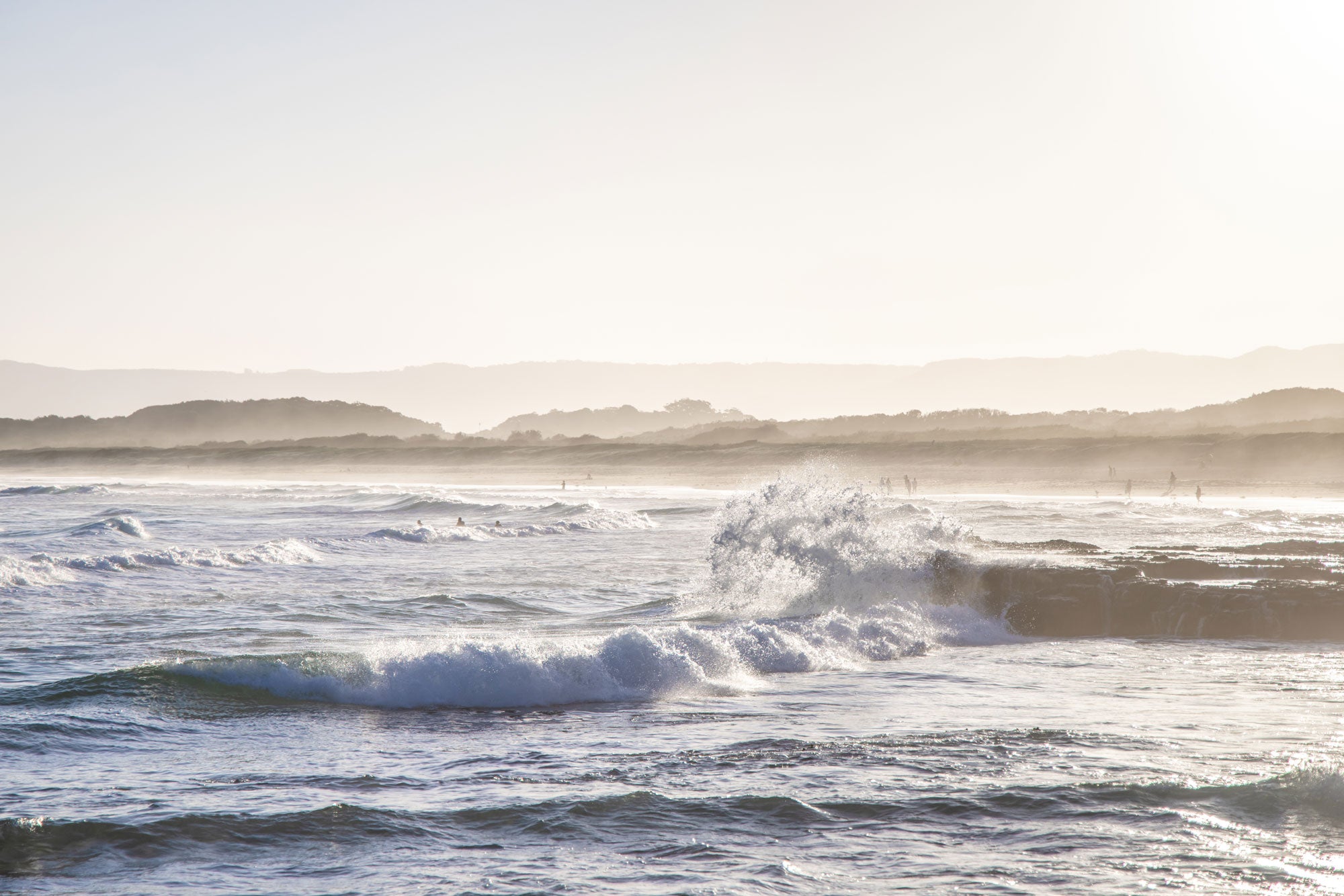 Photographed from the northern end of Port Kembla Beach at sunset, this warm, hazy scene captures a wave breaking against a flat rock, bathed in golden light and softened by the evening glow.